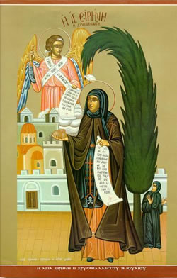 Τήν τοῦ κόσμου εὔκλειαν, καταλιποῦσα Ὁσία, τῷ Χριστῷ νενύμφευσαι, τῷ Βασιλεῖ τῷ ἀφθάρτῳ, κάλλεσι, τῆς παρθενίας λελαμπρυσμένη, σκάμμασι, τῆς ἐγκρατείας πεποικιλμένη· διά τοῦτό σε Εἰρήνη, ὁ σός Νυμφίος λαμπρῶς ἐδόξασε.