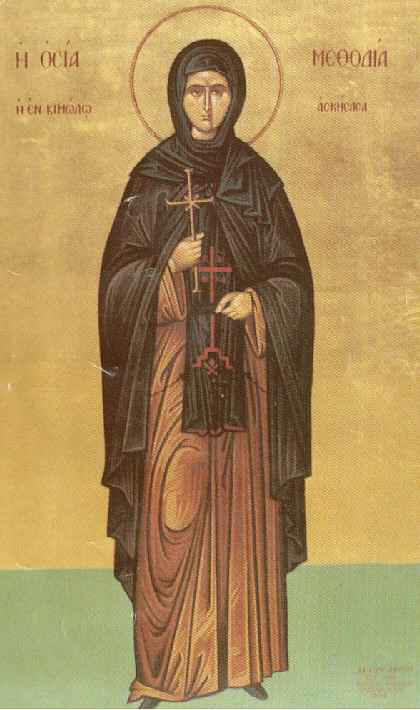 Η Άγια από μικρή είχε κλίση προς τα θεία και πάντα σύχναζε στην Εκκλησία. Όταν ήλθε σε κατάλληλη ηλικία, για να μη λυπήσει τους γονείς της, παντρεύτηκε έναν ναυτικό στο επάγγελμα. Αν και παντρεμένη, ο ζήλος της προς την εκκλησία παρέμεινε αμείωτος. Κάποτε όμως ο άντρας της, σε κάποιο του ταξίδι, ναυάγησε κοντά στη Μικρά Ασία και δεν ξαναγύρισε στην Κίμωλο. Τότε η Ειρήνη έγινε μοναχή στο ναό της Παναγίας της Οδηγήτριας στην Κίμωλο, από τον τότε Αρχιεπίσκοπο Σύρου Μεθόδιο μετονομασθείσα αντί Ειρήνης, Μεθοδία. Η χαρά της ήταν μεγάλη και ακολούθησε τα ευαγγελικά προστάγματα του Κυρίου με όλη της την ψυχή. Οι ασκητικοί της αγώνες ήταν μεγάλοι και αποτελούσε ζωντανό παράδειγμα για όλους. Η φήμη της μεγάλης της αρετής διαδόθηκε παντού και πλήθος γυναικών πήγαιναν να τη συναντήσουν, προκειμένου να βρουν πνευματικό καταφύγιο και λιμάνι από τις τρικυμίες της ζωής. Ο λόγος της Αγίας ήταν δροσιά και ίαμα στις ταλαιπωρημένες ψυχές. Επίσης η Μεθοδία, εκτός των άλλων χαρισμάτων, αξιώθηκε από τον Θεό και το χάρισμα να κάνει θαύματα.