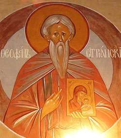Τῆς ζωαρχικῆς, τοῦ Λόγου θεοφανείας, σκεῦος ἐκλεκτόν, Θεόφανες καὶ θεράπων, τῷ ἐνθέῳ σου βίῳ, θεόφρον γενόμενος, τὴν Εἰκόνα τὴν ἐνσώματον, τοῦ Χριστοῦ σεπτῶς ἐτίμησας, ὁμιλήσας πολλαῖς θλίψεσιν· ἀνθ’ ὧν θαυμάτων πηγήν, εἴληφας ἐκ Θεοῦ.